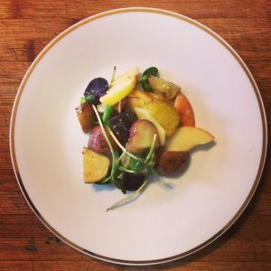 Preheat oven to 450°F. Cut potatoes into quarters. In a bowl, coat the potatoes with 2 tbsp olive oil and sprinkle with salt. Spread in a single layer on a baking sheet and place in the oven. Bake until cooked through, about 15 minutes. While it’s cooking, in a small bowl vigorously mix vinaigrette. Remove the potatoes from the oven and set them aside. Chop the apple and green onion. Put the potatoes in a bowl and pour on the vinaigrette. Add apples, green onions, and half a package or more of sunflower microgreens. Toss it all together. Serve warm or at room temperature. Add pepper to taste.